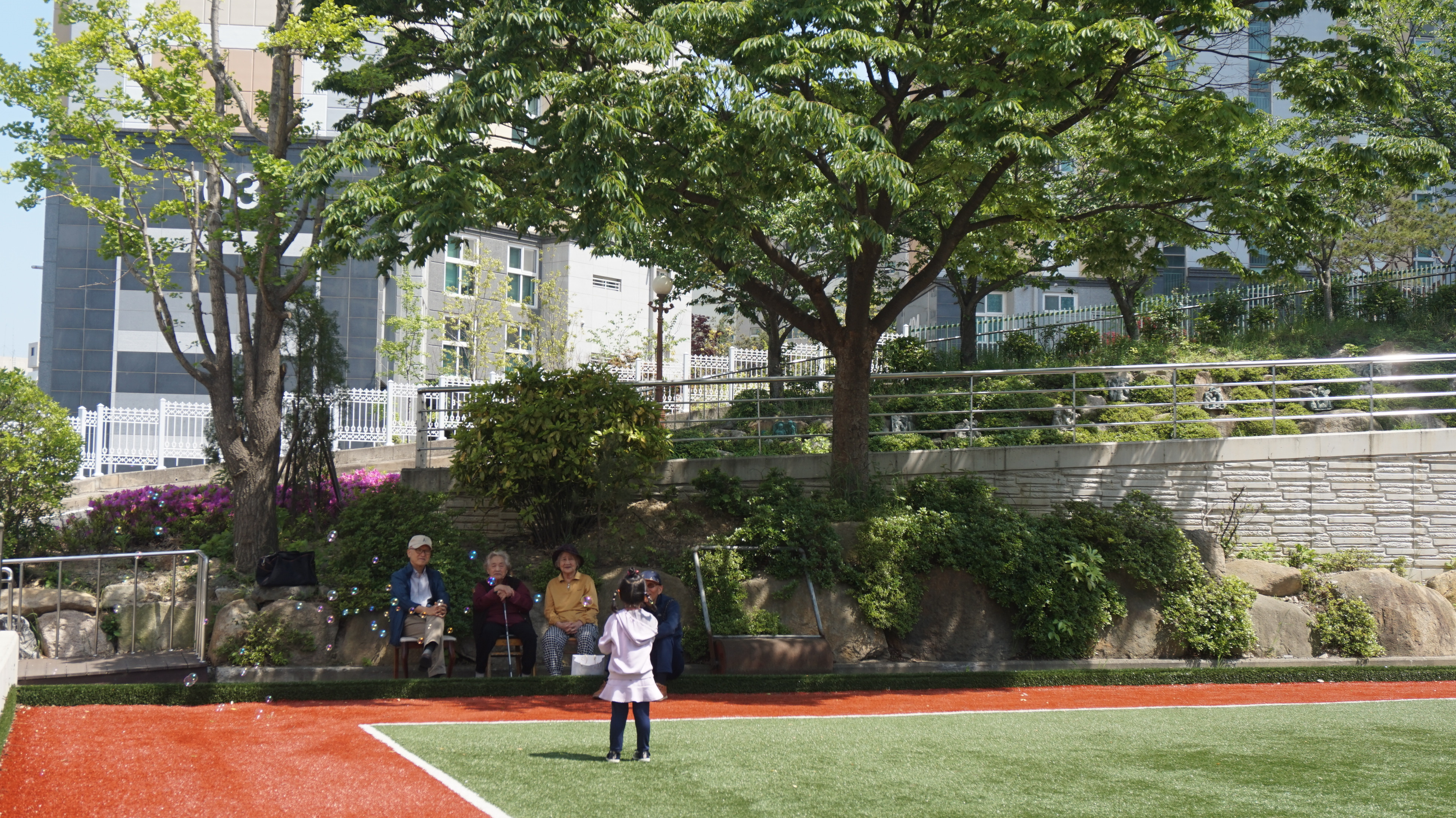 게이트볼장이 있고 뒤에는 흰돌요양병원이 있습니다. 게이트볼장은 거의 매일 어른들이 나와서 공을 치는 곳이고요 이때는 추석으로 생각되는데 볕이 뜨거웠던지 그늘밑에 담소를 나누고 계시네요.