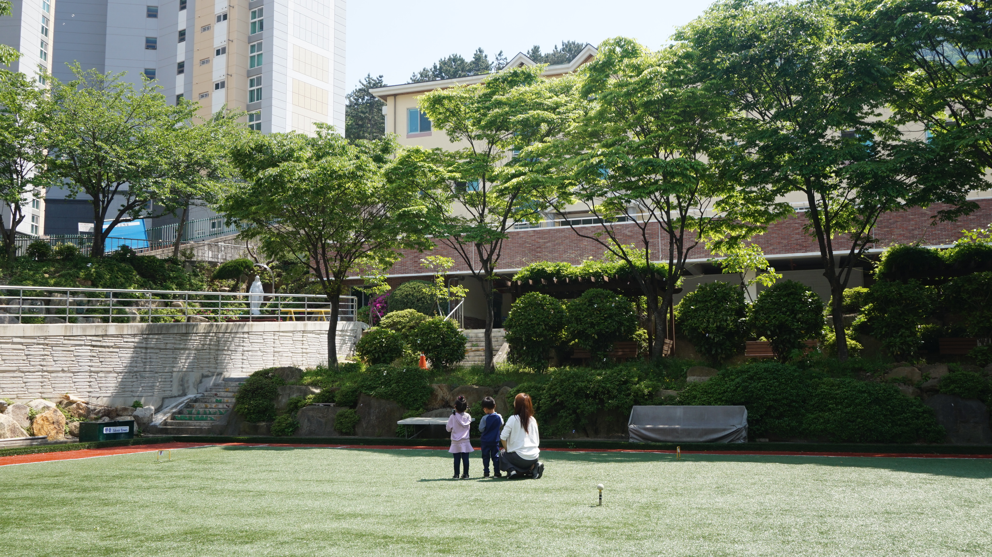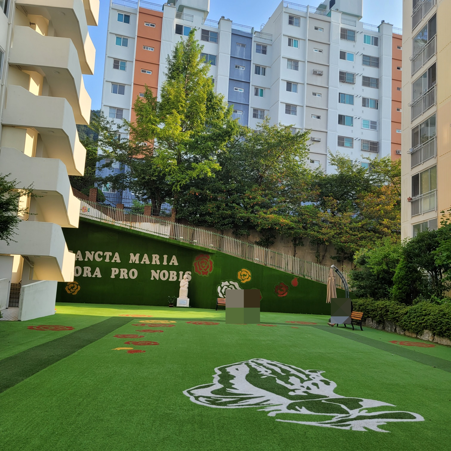 신축동 1층에는 성당이 있고 9층에는 신부님이 계십니다. 맞은편에 기존 타운이 있는데 동 간 거리가 괜찮습니다. 기존타운 뒤편에는 기도광장이 있어 부활절 미사를 지내기도 합니다.