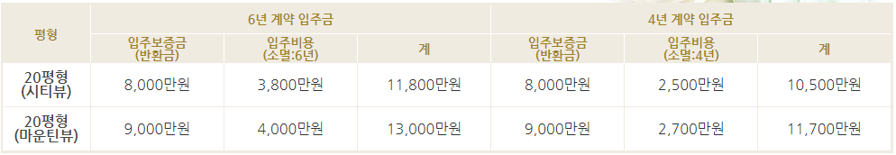 - 시티뷰 : 6년 계약시 11,800만원, 4년 계약시 10,500만원